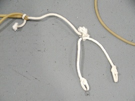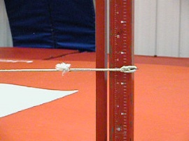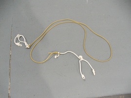 First, make a “Y-end” bungee by tying a 12” piece of rope to each end of a 10 ft. piece of 1/4” surgical tubing or red theraband tubing. (Sheet Bend knot works best) Tie or connect another 12” piece of rope to the ends of the rope pieces to form a “Y”. Tie a knot on one end of the “Y” (I used to use an “S” hook then figured out how stupid that was and now just use a knot) and make a loop in the other end so that the “Y” can be hooked around the standard upright. (Put the knot through the loop and it acts like a Chinese button and holds really well) Because the surgical tubing is only 10 ft, there is enough tension to hold it at any height. (Great for Jr. Hi. practice, too)