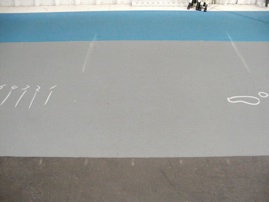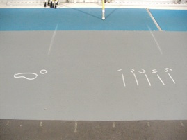 OK, here we go… have your vaulter put their left foot on the foot outline and take two large steps back. Right foot back, then left foot back. They will end up on the back scale and have them remember their number so they don’t have to step back every time. Now, they move forward, right step, then left and jump, driving their right knee. They take off left, land left, and walk out of it.
