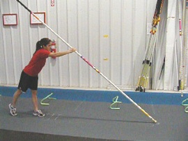They step and jump as before only now they use both hands on the pole and “row” themselves to go farther on the front scale. I have them do this until they can smoothly jump and land straight and in control, keeping their top right arm straight through the whole drill.