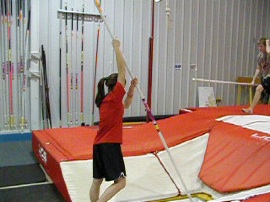 I have them simply put the pole on their shoulder (with proper grip spacing) and step, jump, take off, and ride the pole to the top of the pit and walk across the “big box” on top of the pit.