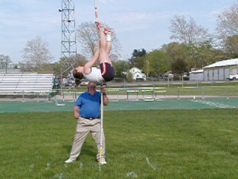 One of the biggest challenges is getting young vaulters to turn over at the bar. Most of them tend to do “Mississippi Flat-back” vaults. (That’s what we call it in Amherst) Anyway, I was at a meet last Saturday and saw the most incredible turn over drill ever. Don’t know who to credit with it, but we figured it out and added to it.