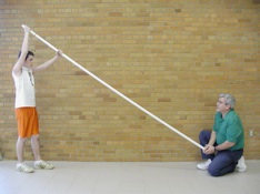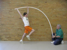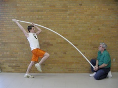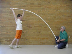 Since it’s only 10’ long, hold the bottom end up off of the floor to get a more realistic angle. Have your vaulter hold the pole like they’re ready to take off. Have them walk forward and move their front hand to their forehead and try to bend the pole as they walk toward you. They will find it very difficult to bend.