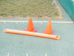 I got this idea from a University of Tennessee vaulter. They used athletic tape across the cones, but I find that the kids are afraid of dragging the cones if they hit the tape. They don’t seem to mind jumping over the noodle because it’s so light.