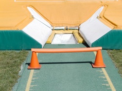 Start out using a short, light pole that your vaulter is totally confident jumping on. Set the noodle on the cones about 2 ft. in front of where they take off and have them practice jumping over the noodle while planting the pole. Do this until they get used to jumping over the noodle. They get used to it pretty fast. (If you set the noodle closer that 2 ft. to begin with, they will take off about a foot too far out and go for a wild ride)