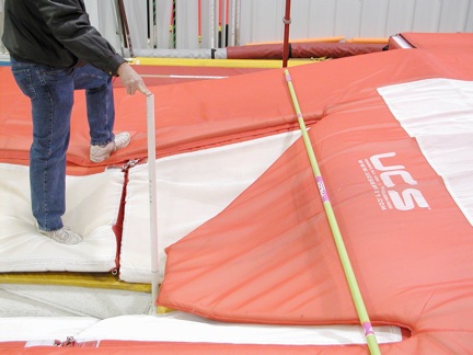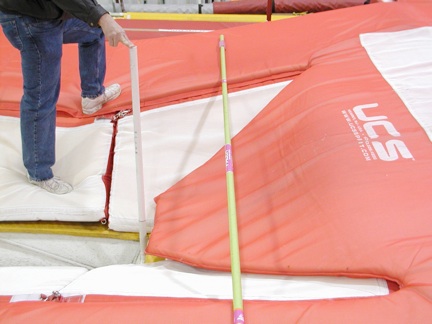 It’s tough to relate to where the bar is when it’s up on the standards 10-15’ up, so, lay a cross bar right on the pit and place it 15 1/2” from the back of the box. They can see right away that it doesn’t leave them much room to mess up. If they clear the bar, they land at the top of the slope, if they come up short, there isn’t much to land on. Next, lay the bar across the pit at 31 1/2” and they can see they have much more room to vault and that they will land well into the pit when they go over the bar.