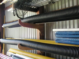 Put your poles in plastic pipe tubes or paper tubes to protect them from anyone who might hit them while storing other equipment. We use 4” corrugated plastic drainpipe from Carter Lumber. It works great.